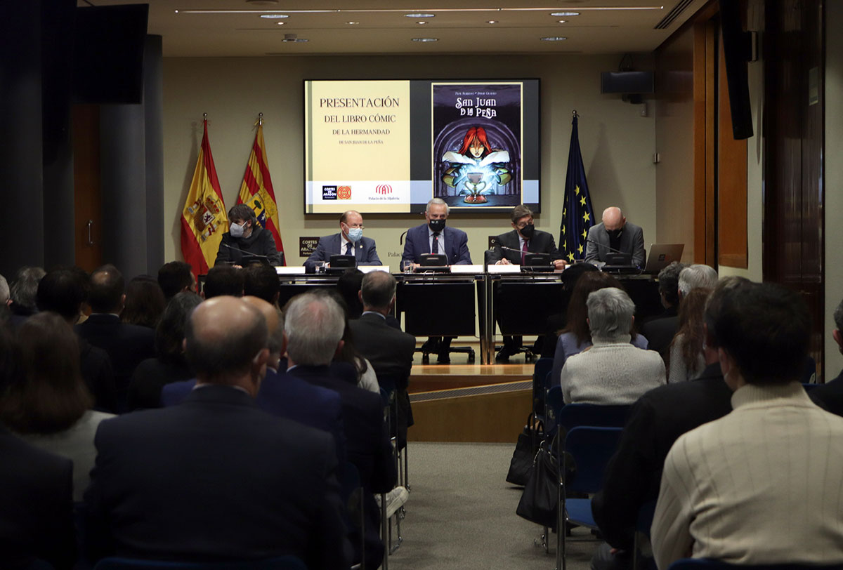 A la presentación también han asistido el presidente de las Cortes de Aragón, Javier Sada; el vicepresidente del Gobierno de Aragón, Arturo Aliaga, y el Hermano Mayor de la Real Hermandad de San Juan de la Peña, Félix Longás.