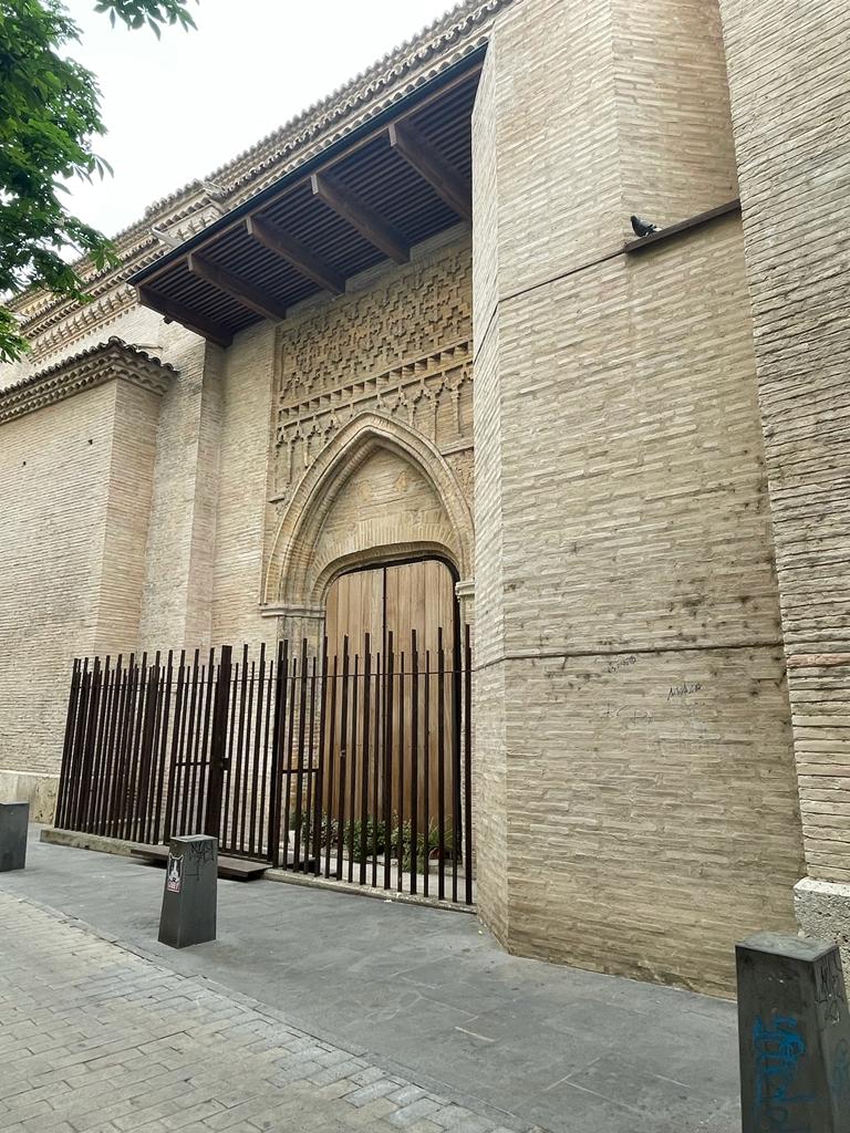 Desde el exterior, más allá de esta puerta, este ábside no ha cambiado en exceso su aspecto, y mantiene su forma poligonal, en cuyos muros se mantienen los frisos de ladrillo decorativos, formados a partir de arcos mixtilíneos entrecruzados y cruces brazos romboidales. Unas formas ornamentales carismáticas dentro del arte mudéjar, un estilo único, que solo tuvo lugar en territorios reconquistados a los musulmanes y donde los artesanos mantuvieron durante siglos el influjo del arte islámico.
